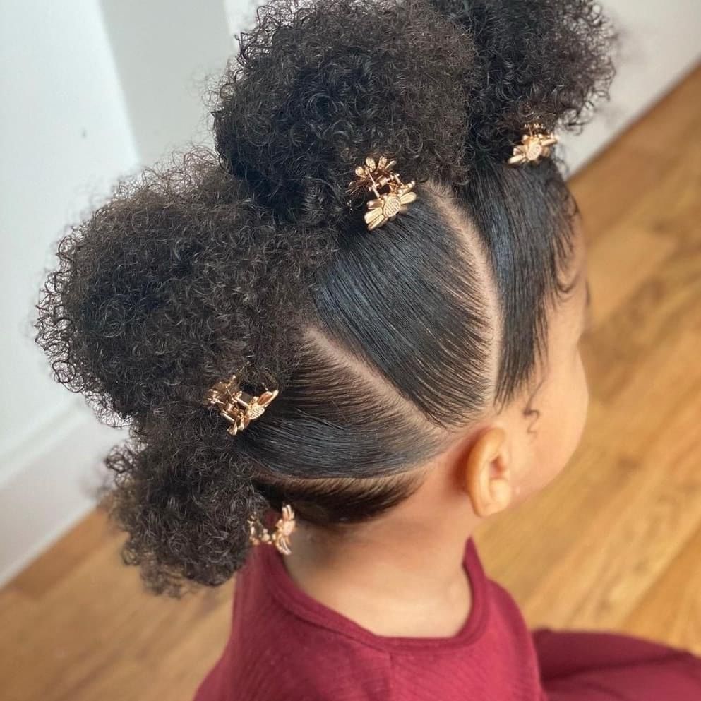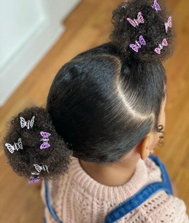 Transforming a standard double-bun look into something whimsical is easily achieved with the right accessories, as seen in this asymmetrical puff style. The hair is divided with a clean, curved part and gathered into two voluminous puffs positioned at different heights to create a modern, playful silhouette. To finish the look, small butterfly clips in varying shades of purple are scattered throughout the puffs, adding a layer of texture and charm. This approach is perfect for textured hair, as it celebrates natural volume while keeping the morning routine short and the results securely in place for a full day of school or play.