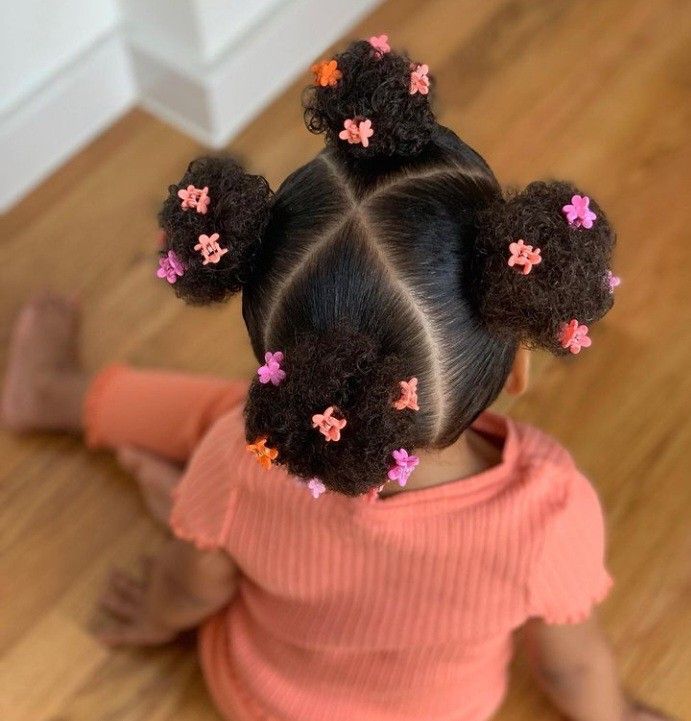 For a balanced look that evenly distributes volume, dividing the hair into four equal quadrants creates a sturdy and playful silhouette. Using a clean “X” part at the crown, each section is gathered into a small puff and secured with snag-free elastics. This style is particularly effective for active kids as it keeps weight distributed and prevents the hair from pulling or becoming loose during play. Scattering small, colorful star-shaped clips throughout the puffs adds a bright, decorative finish that takes only seconds to apply but makes the overall look feel personalized and intentional for school or weekend outings.