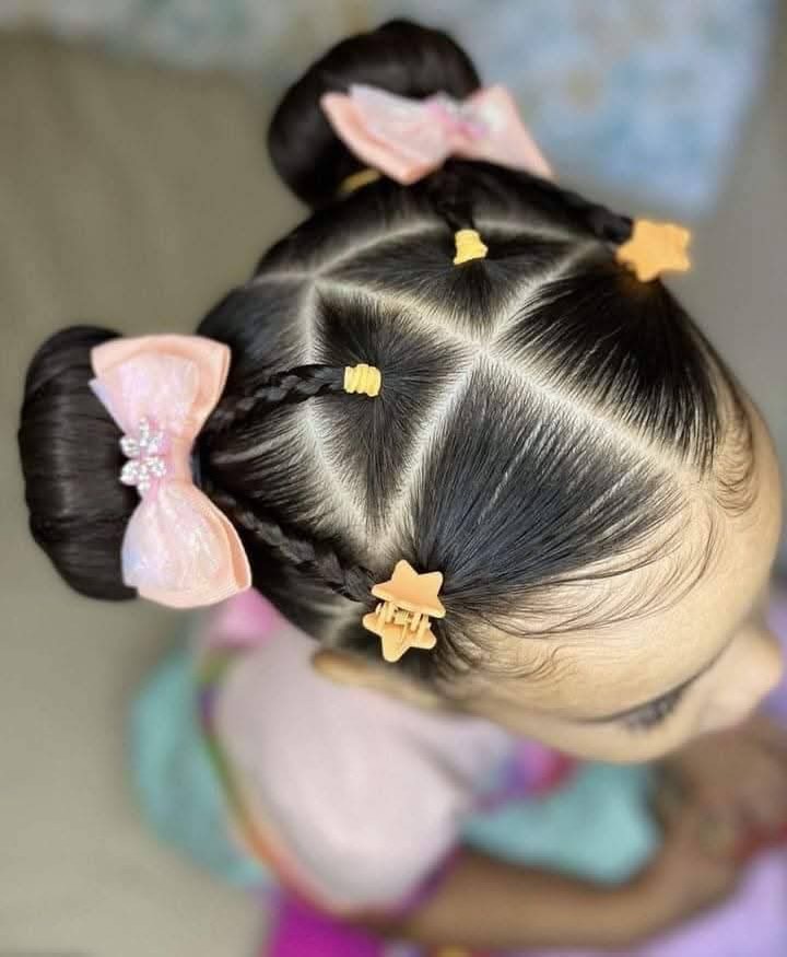 Creating a high-impact look often starts with the foundation of the style, as seen in this geometric parting technique that organizes hair into clean, triangular sections. By using a rattail comb to create precise lines, you can gather hair into small individual ponytails secured with colorful elastic bands or star-shaped clips before feeding them into two larger buns. This structured approach not only looks professional but also serves a functional purpose by keeping flyaways flat and ensuring the style remains intact during physical activities. Adding soft pink bows at the base of each bun provides a charming finish to a look that balances technical precision with a playful, youthful energy.