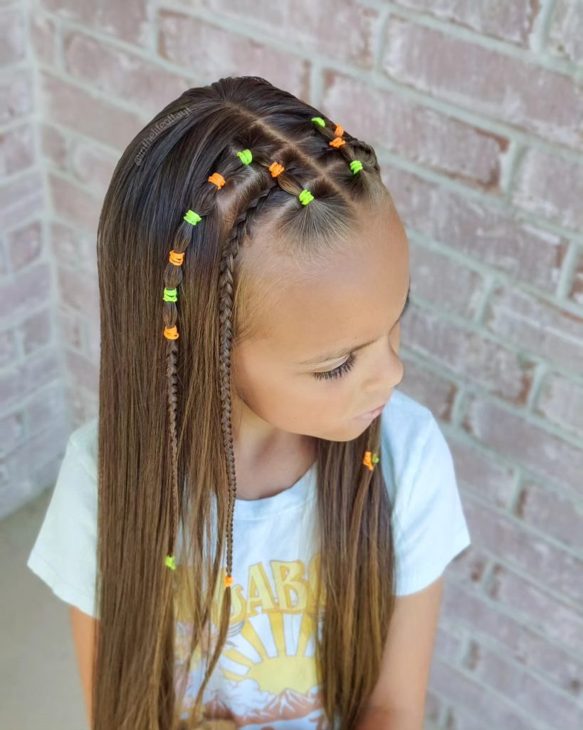 Adding a pop of color to straight or smoothed hair can be achieved quickly through small, repetitive sectioning along the hairline. By gathering tiny segments of hair and securing them with neon-colored elastic bands in a row, you create a structured “headband” effect that keeps hair flat and organized. This technique is ideal for mornings when you want a look that feels more intricate than it actually is, as it requires no complex braiding or twisting skills. The result is a vibrant, durable style that keeps the face clear and holds its shape regardless of gym class or recess activities.