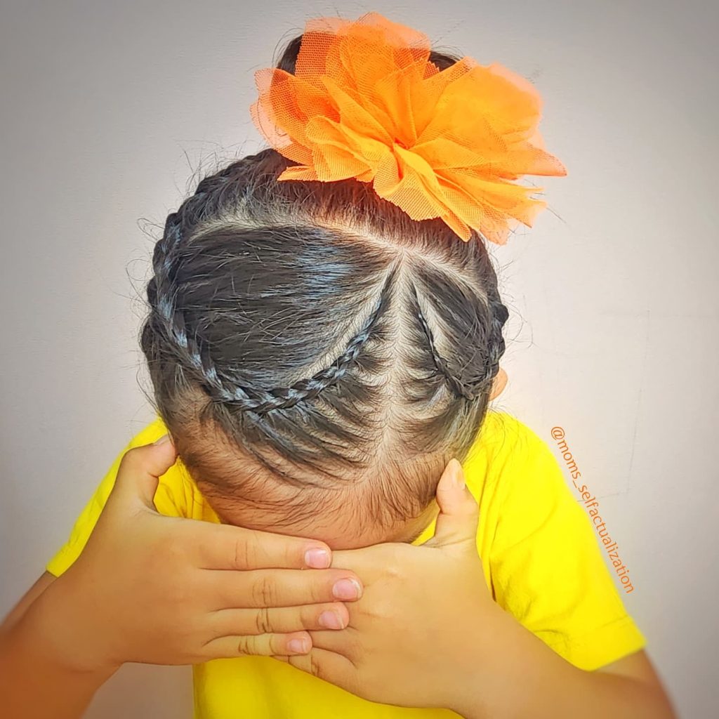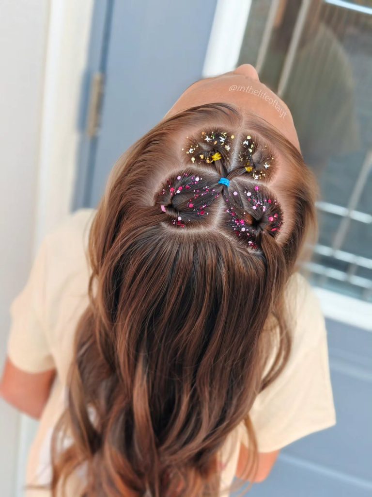 For a style that feels special yet remains grounded in simplicity, this heart-shaped sectioning adds a delightful focal point to a half-up hairstyle. By dividing the top section of the hair into three small, triangular segments and securing them with colorful bands, you can create a central “clover” or heart motif that feeds into the back. The inclusion of subtle glitter or small decorative beads within these sections adds a celebratory touch that is perfect for birthdays or school events. This technique ensures the hair stays flat against the head and out of the eyes, allowing the rest of the hair to flow naturally in soft, manageable waves.