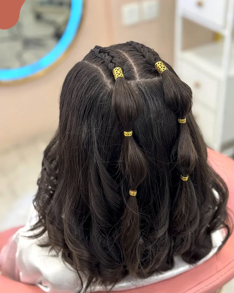 Combining the elegance of soft waves with the practicality of a secured front, these half-up bubble rows are ideal for keeping hair out of the face while showcasing natural length. Two parallel rows of hair are sectioned from the hairline to the crown and divided into small “bubbles” using gold metallic bands. This creates a repetitive, eye-catching pattern that adds a modern flair to the overall look. Because the rest of the hair is left loose, it maintains a sense of movement and comfort, making it a versatile choice for school pictures or weekend events where both durability and aesthetic appeal are priorities.