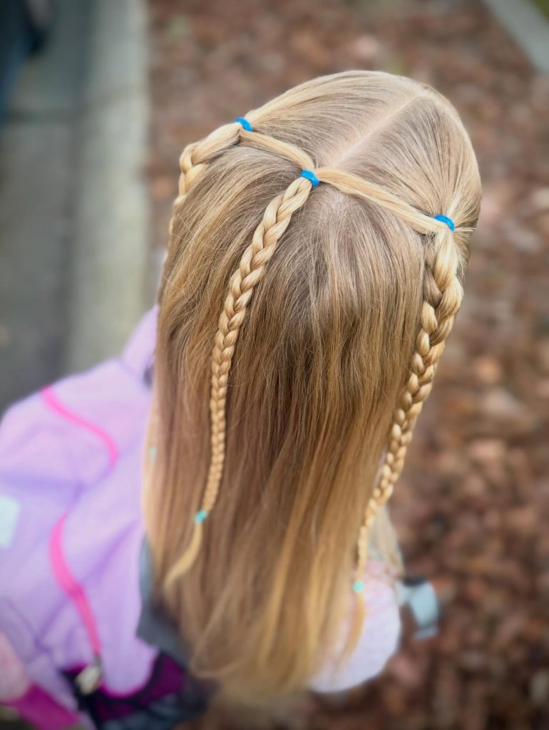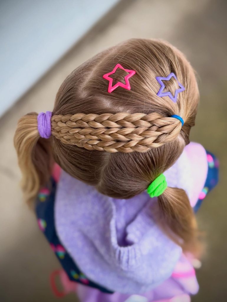 Creating a “braided headband” effect across the crown is a simple way to manage loose hair while maintaining a playful, half-up aesthetic. This look involves taking a horizontal section of hair and weaving it into three parallel braids that rest across the top of the head, secured at the ends with colorful elastics and star-shaped clips. This structured “band” keeps hair out of the eyes without the need for plastic headbands that can slip or cause discomfort. It is a versatile choice that pairs well with loose waves or a side ponytail, offering a secure and stylish solution for school days that require both focus and a touch of flair.