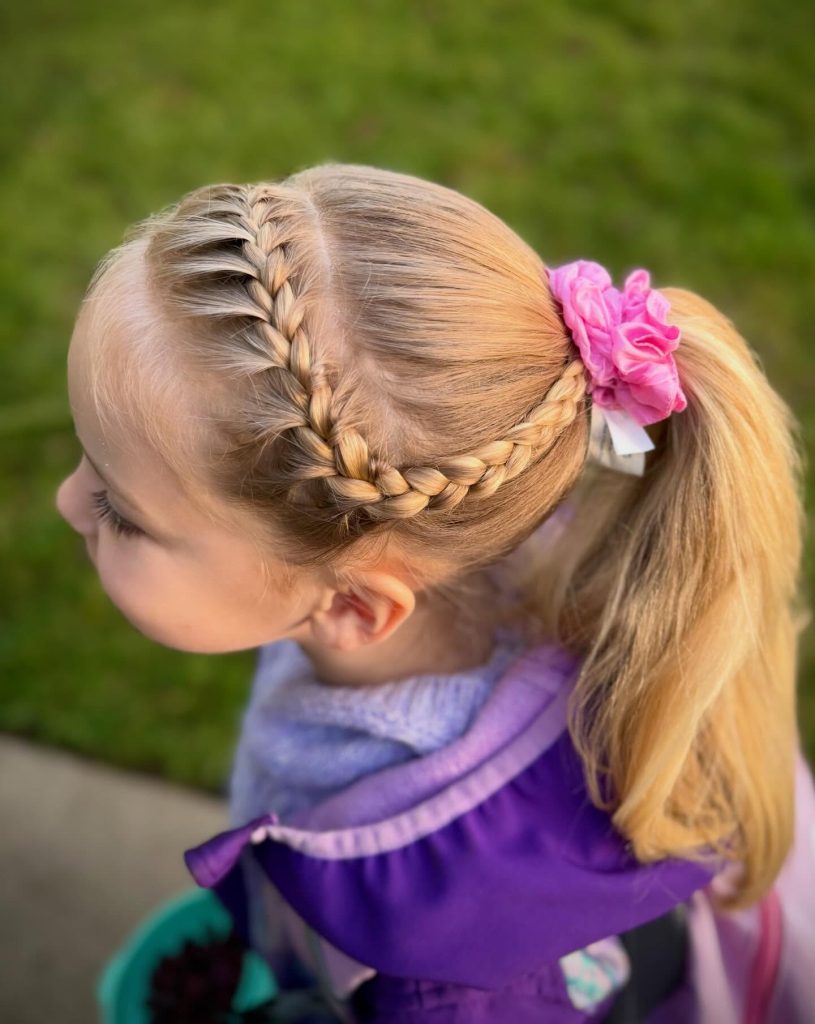 Integrating a simple side braid into a standard ponytail is a fantastic way to add texture and security to finer hair textures. The style features a Dutch or French braid that travels along the side of the head, acting as a sturdy anchor for shorter layers before being pulled into a mid-height ponytail. Adding a soft floral or bow accessory at the base of the tie provides a bright, personalized finish that makes the routine feel intentional. This approach is excellent for active kids because the braid prevents flyaways from slipping out during movement, ensuring the style remains neat and organized from the morning commute until the end of the day.