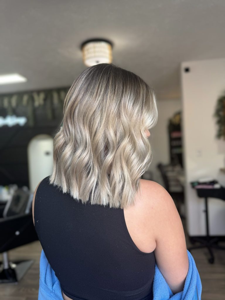 This look introduces a textured, “off-duty” energy to the blunt bob trend by combining a sharp baseline with vertical, piecey waves. The platinum highlights accentuate the “ripped” ends, giving the hair a dynamic movement that still honors the strict horizontal weight line underneath. It is the ideal choice for those who want a graphic silhouette that remains versatile enough to be worn with a more relaxed, effortless finish without losing its intentional edge