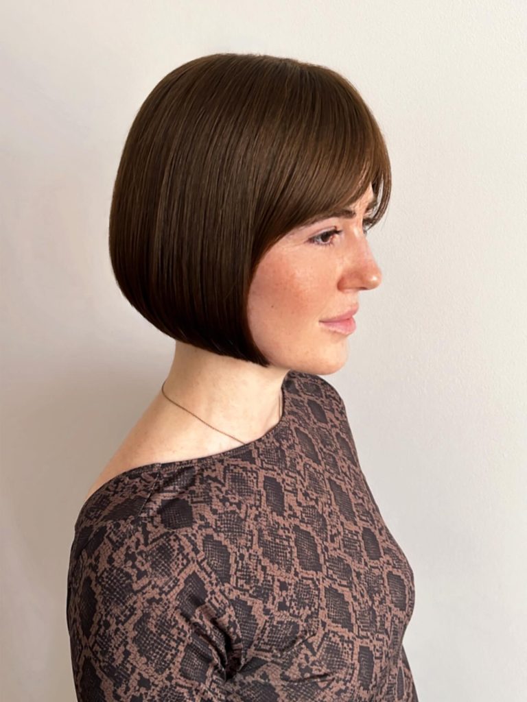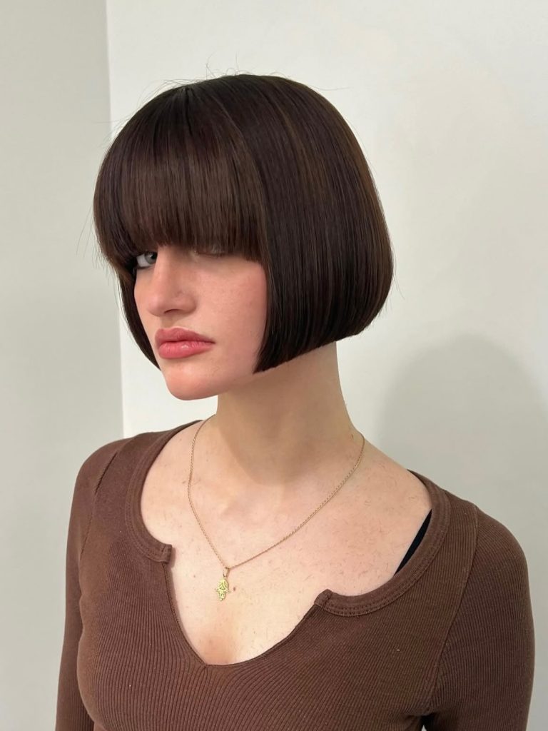 This look showcases the classic blunt bob at its most sophisticated, featuring a clean, horizontal edge that hits just below the chin. The deep brunette strands are styled with a high-shine finish, emphasizing the “glass hair” effect that makes a blunt cut feel like a deliberate design choice. By utilizing the invisible bevel technique, the ends tuck slightly inward toward the jawline, ensuring the silhouette remains sleek and controlled rather than boxy.