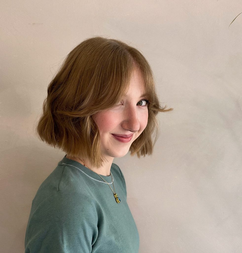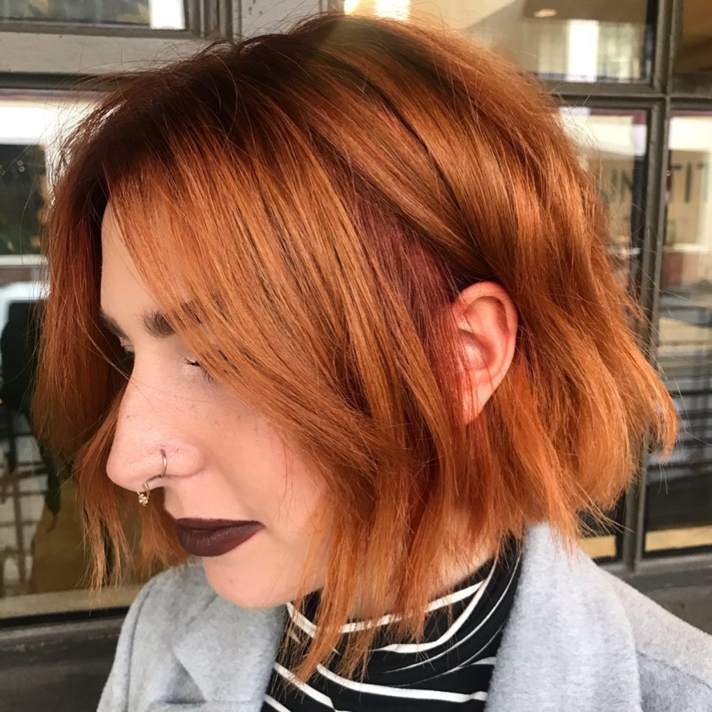 This vibrant ginger-toned style showcases the “Ripped Bob” technique, blending a horizontal blunt baseline with piecey, vertical texture. The deliberate “imperfections” in the finish provide a modern, edgy contrast to the solid perimeter, making it a versatile option for those who prefer an off-duty aesthetic. By maintaining a sharp weight line at the bottom, the cut ensures that even with beachy waves and textured ends, the overall silhouette remains rooted in the “clean line” philosophy.
