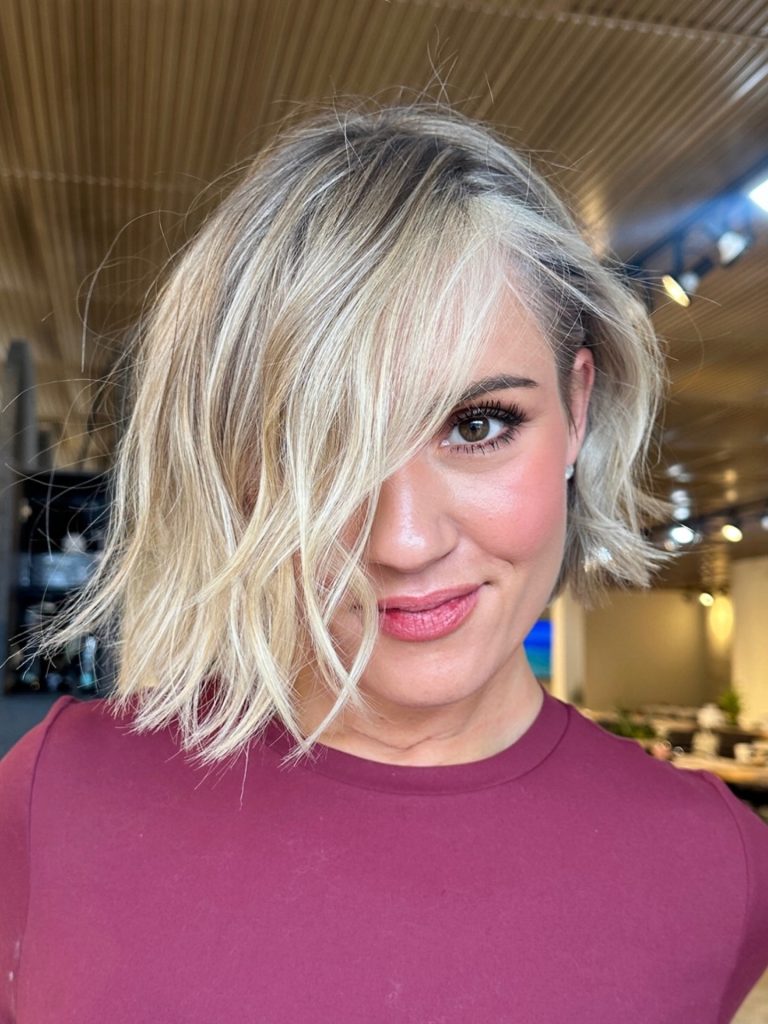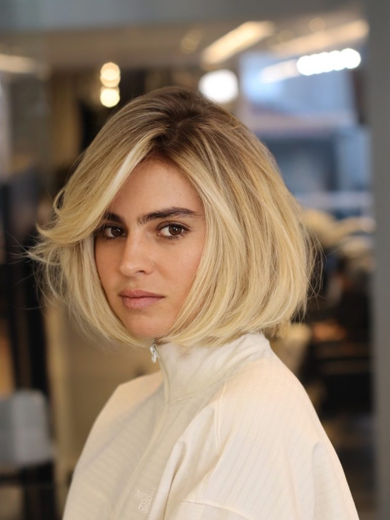 Offering a softer take on the clean-line aesthetic, this creamy blonde bob uses subtle internal weight removal to achieve maximum bounce and swing. While the bottom edge remains strictly blunt, the styling incorporates a sweeping, “old Hollywood” volume that contrasts beautifully with the sharp perimeter. It serves as the perfect example of the 2026 “Varsity” vibe, where the cut’s structural integrity allows for glamorous, airy movement without the need for traditional surface layers.