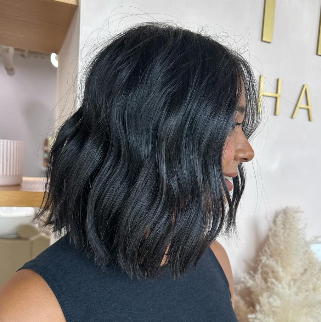 Combining a blunt baseline with deep, vertical texture, this ink-black style is a masterclass in the “ripped” aesthetic. The wave pattern softens the overall look while the ends remain strictly horizontal, ensuring the graphic integrity of the bob isn’t lost in the movement. It is the ultimate choice for those who want the density of a blunt cut but crave a more dynamic, “cool-girl” finish that catches the light through every intentional ridge.