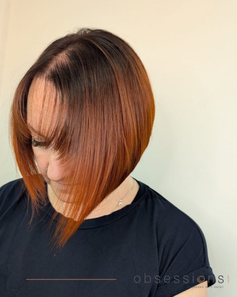 This chin-length bob highlights how a deep copper gradient can emphasize the precise architecture of a blunt cut. The solid, clean-cut perimeter provides a sharp contrast to the soft, piecey fringe, creating a sophisticated balance between structural strength and facial framing. By maintaining a single, deliberate weight line at the base, the style ensures the hair looks remarkably thick and healthy, serving as a prime example of why removing graduation is the key to 2026’s most confident silhouette.