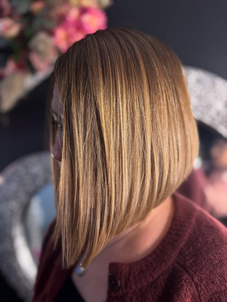 This honey-toned blunt cut demonstrates how a clean perimeter can be used to create a dramatic, forward-leaning silhouette. By maintaining a solid weight line that angles slightly toward the chin, the cut provides a sharp, structured frame that feels both intentional and modern. The lack of surface layers allows the multi-dimensional color to shine, proving that when the lines are this precise, the hair becomes a powerful accessory in its own right.