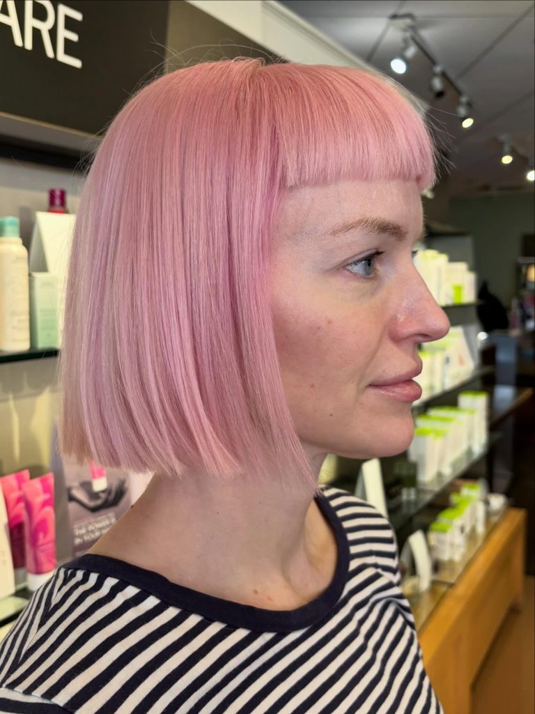 This striking bubblegum pink look pairs a sharp, neck-skimming perimeter with an ultra-short micro-fringe, heightening the graphic impact of the 2026 blunt trend. The monochromatic color choice removes any visual distraction, forcing the eye to focus on the deliberate, horizontal lines of the cut. By eliminating all softening around the face, this style achieves a high-fashion, “editorial” silhouette that feels modern, powerful, and entirely intentional.