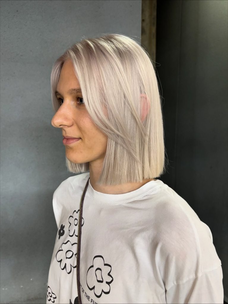 This shoulder-grazing blunt cut uses a cool platinum palette to make the clean, horizontal baseline the focal point of the style. The absence of traditional layers ensures that the hair retains its thickness from root to tip, creating a solid architectural shape that feels fresh and sophisticated. By pairing the sharp perimeter with subtle face-framing tucks, the look achieves a balanced, curated vibe that defines the “quiet luxury” of modern hair trends.