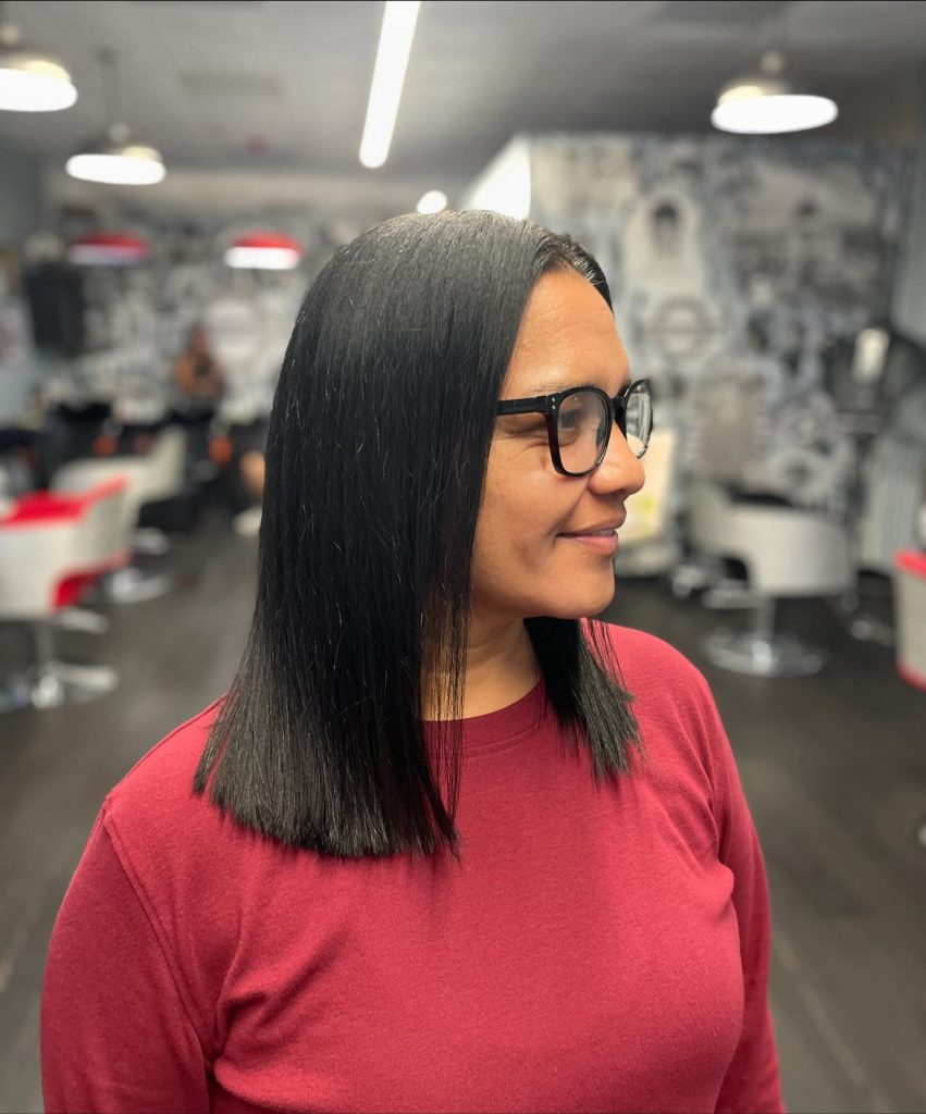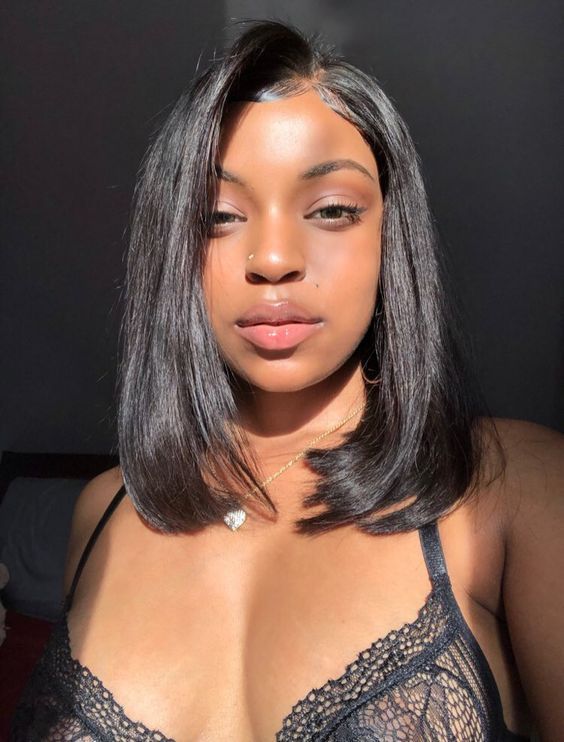 This variation showcases the “liquid hair” trend on natural texture, achieved through a high-shine silk press. The cut is a precise, uniform length that hits just below the collarbone, offering a sleek and elongated silhouette. It’s a perfect example of how a minimal, no-layer approach can highlight the health and reflective quality of the hair.