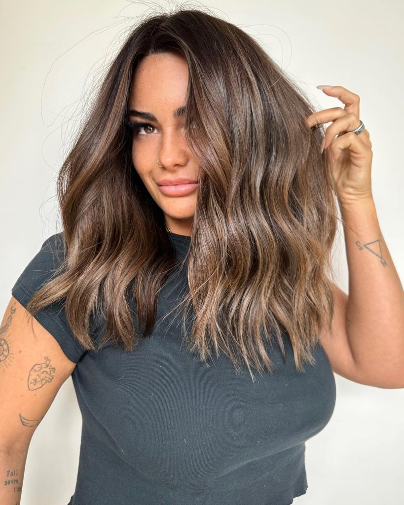 A classic shoulder-grazing lob rendered in dimensional brunette with soft, sun-kissed balayage. This look captures the 2026 “rich girl” aesthetic, defined by glossy, healthy-looking texture. The hair is styled with subtle, internal layering that creates sophisticated, understated movement, perfect for a modern, polished style that feels both high-end and effortless.