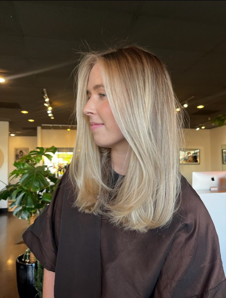 A voluminous, glamorous take on the collarbone lob, executed in a clean, icy blonde shade with subtle dimensionality. This profile view emphasizes the rounded internal layers that allow for natural lift and dynamic swing. It bridges the gap between structured polish and “off-duty model” volume, showing the dynamic possibilities of modern invisible layering.