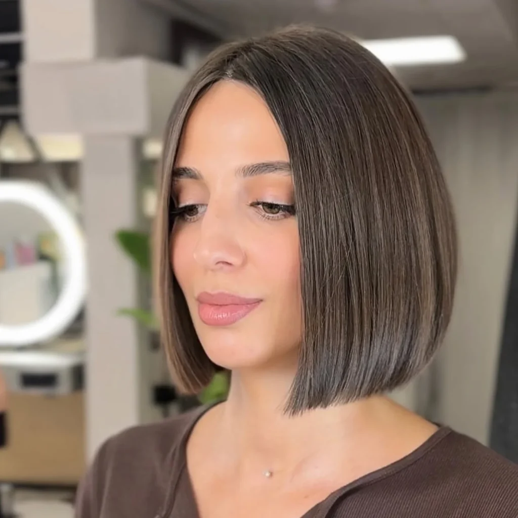 A sharp, jaw-skimming lob that exemplifies the clean-line aesthetic. The cool ash brunette tone is perfectly uniform, highlighting the precision of the blunt ends. This variation is ideal for those seeking a highly architectural silhouette that maintains its shape with minimal daily effort.