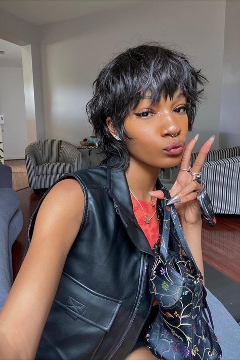 This image provides the perfect look at a very short shag-bob hybrid length, leaning almost into a pixie cut. It’s a fantastic example of the “no-tool result” described in your outline. The cut features sharp, jagged layers that utilize the model’s naturally coarse and dark hair texture to build movement and texture without heavy styling products. It beautifully supports the “Shag Variations” section by defining the shortest edge of the trend.