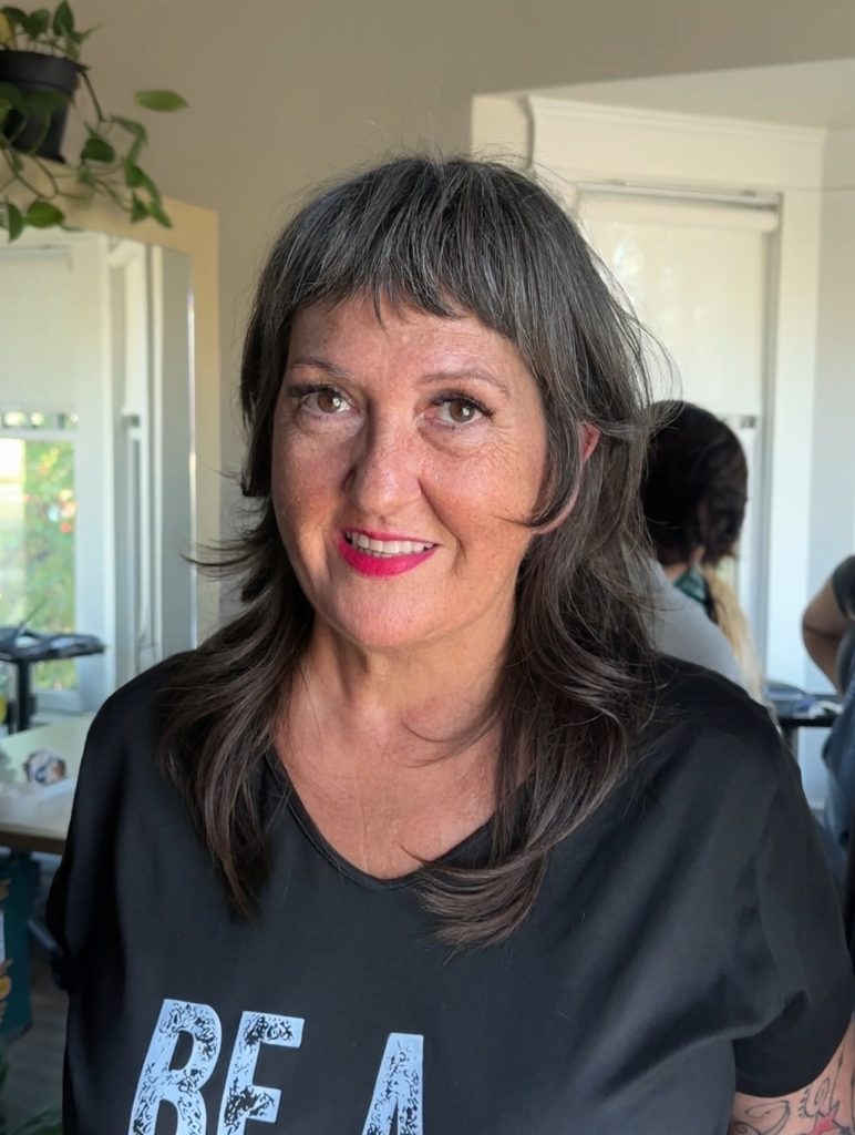 A perfect example of how the shag can be adapted to flatter any age group. This shoulder-length, dark gray style combines internal layering to create body with an ultra-short, textured baby fringe. The overall look is edgy yet refined, utilizing softer, point-cut layers rather than a heavy razor finish. This placement is ideal for the “Fine Hair” section, showing how to create texture without aggressive thinning.