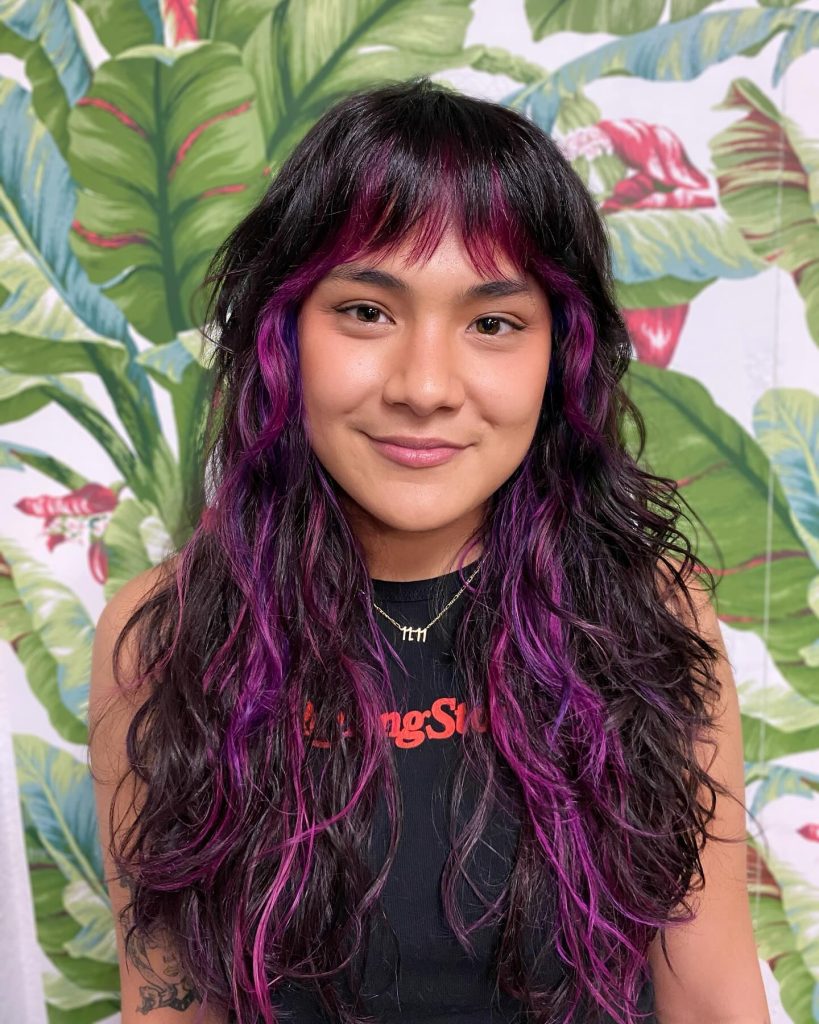 This image provides a dramatic look at how the shag cut can interact with bold color placement. The base is a deep, dark raven with dense, natural curl patterns. Interspersed throughout the layers and the choppy fringe are vibrant magenta-purple streaks. This style uses the internal layers of the shag to reveal hidden pops of color as the curls move, showcasing the cut’s multi-dimensionality on very wavy or curly hair types.