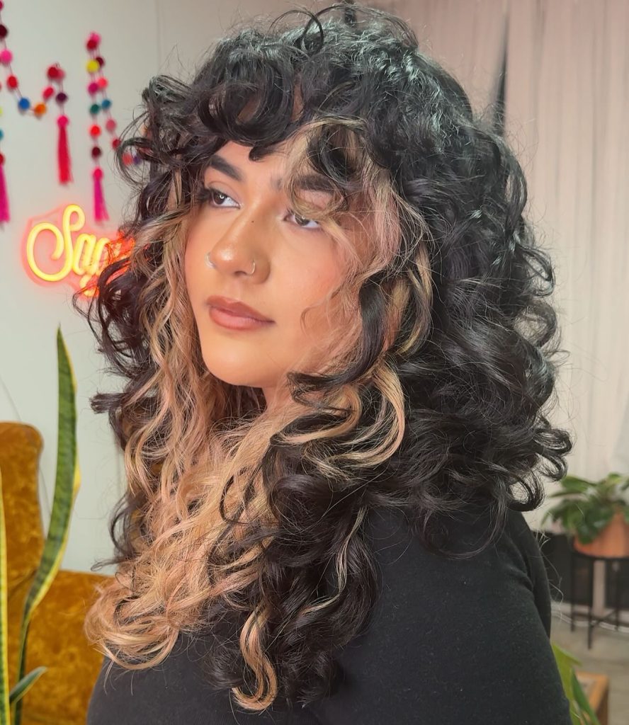 This image is a masterclass in using color to emphasize cut. We see deep, raven-black natural curls cut into a classic shag silhouette with a thick, curly fringe. The technical detail that makes this look “2026” is the intentional placement of wide caramel-blonde panels framing the face. This color placement showcases how internal layers can break up a solid mass of color, creating dimension and depth. It’s an ideal visual for the “Wavy Hair” section.