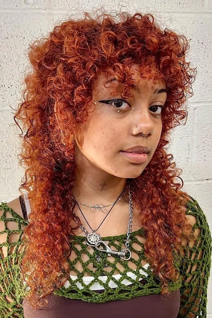 Here we see a beautiful fusion of the shag and a modern mullet on natural, tight copper coils. The structure is heavily stacked at the crown and in the fringe, while the length in the back is kept long and wispy. This technical approach maximizes the texture and volume inherent in coiled hair (Types 3 and 4), proving the shag works for all tight textures. This is a crucial reference point for the “Face Shapes” section, showing how to elongate a look on very curly hair.