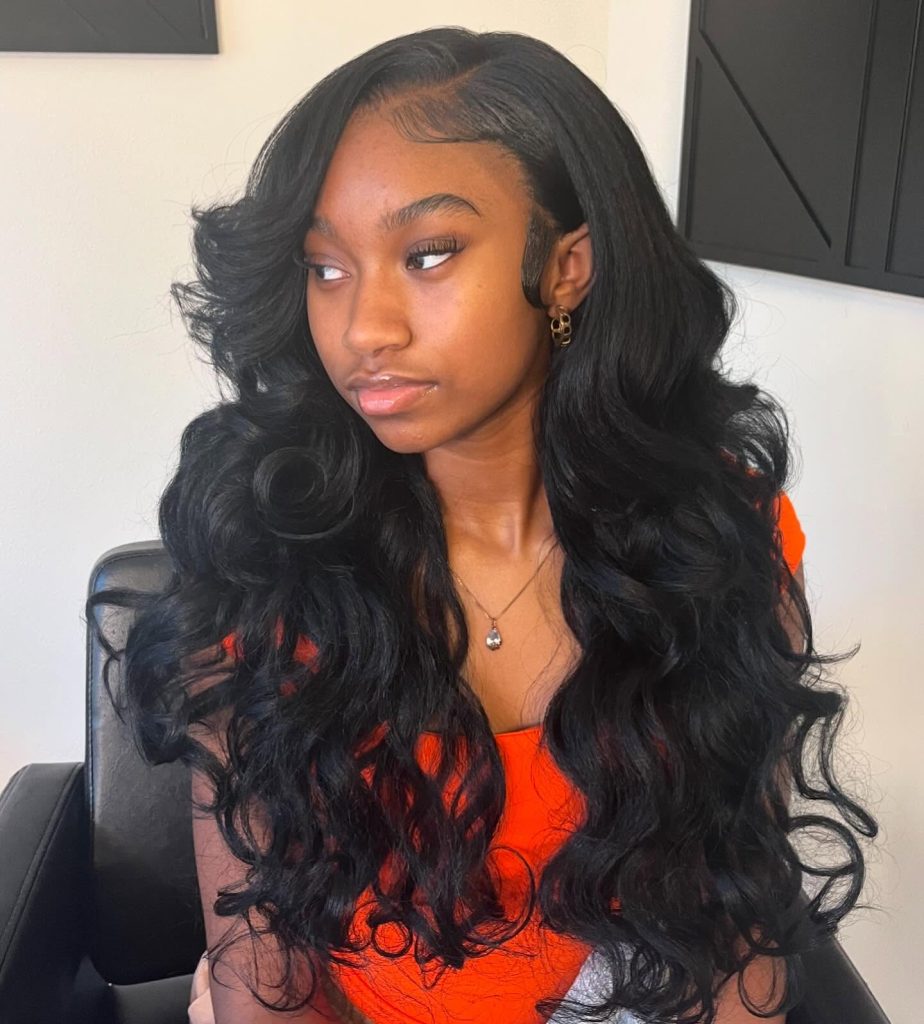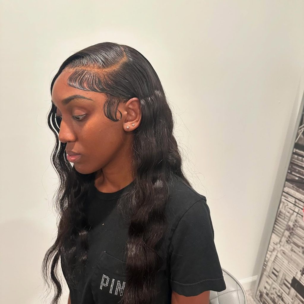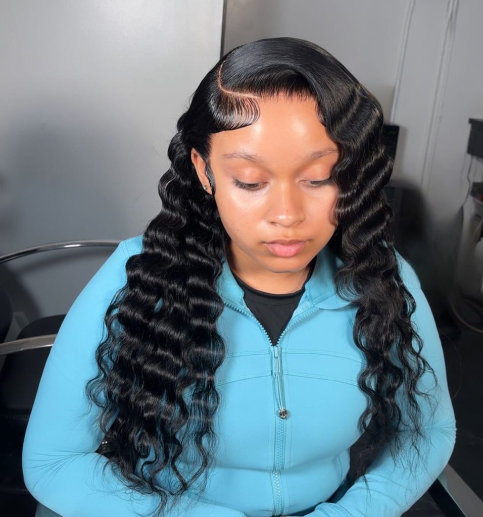 The deep side part sits approximately one inch from the centre of the hairline, creating a pronounced diagonal that gives the style its dramatic, asymmetric quality. This is the version with the most visual impact — it sweeps significantly more hair to one side, creates maximum lift at the crown, and produces the kind of old-Hollywood glamour that photographs particularly well. It works best with waves, textured blowouts, and cuts that have movement through them — the butterfly cut, the lob, long layers.