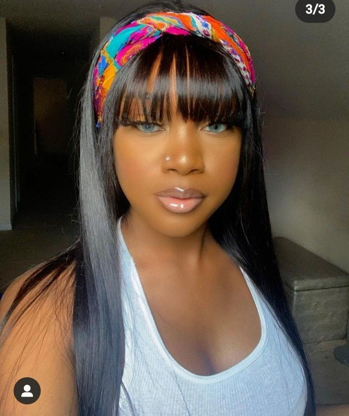 This photograph captures a close-up portrait of a woman looking directly at the camera with a self-assured expression. Her dark, sleek hair is styled with a prominent, wispy fringe that is cut straight across, landing just at her eyebrow line. The bangs are intentionally sparse and textured, allowing her forehead to show through for that classic “see-through” effect. To complete the look, she wears a vibrant, patterned silk scarf as a headband, which pushes her hair back while keeping the bangs framed. She is wearing a simple white ribbed tank top and minimal, soft glam makeup.