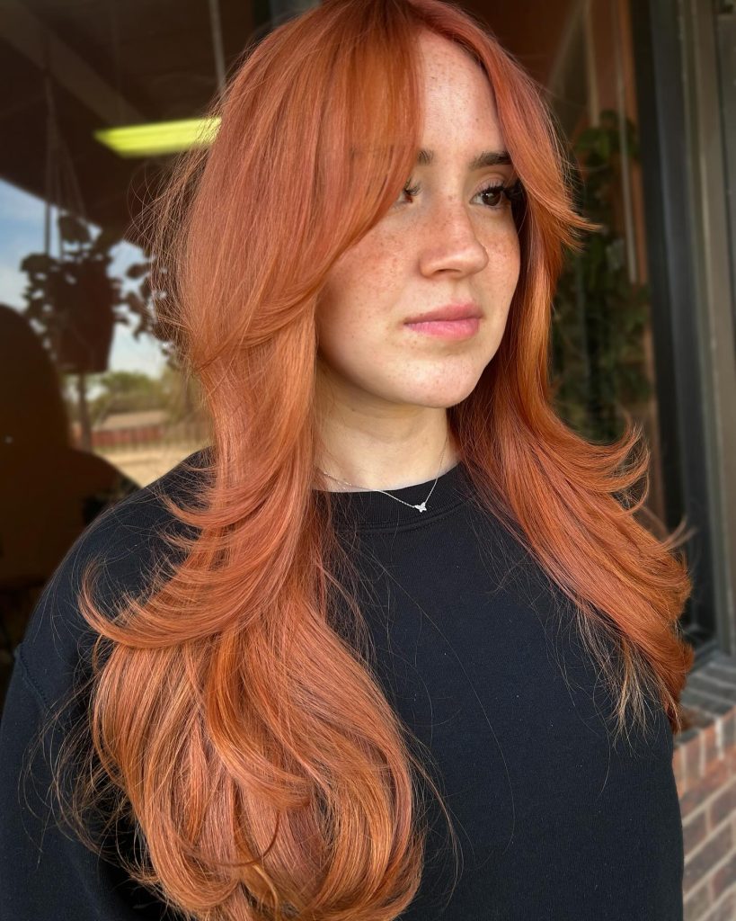 This look features a longer, parted interpretation of the wispy fringe in a vibrant copper hue. The bangs are cut with feathered, point-cut ends that sweep outward, blending seamlessly into heavy face-framing layers. The center is thinned out to maintain a light, airy feel that prevents the warm color from appearing too heavy against the face.