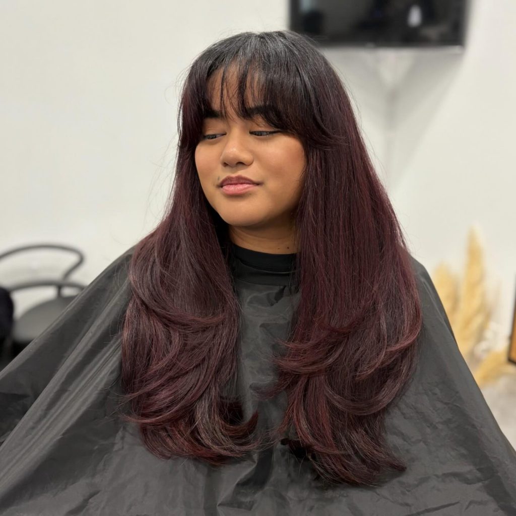 This style showcases a classic “barely-there” fringe paired with voluminous, layered waves in a rich wine-red hue. The bangs are exceptionally light and sparse, allowing the forehead to remain clearly visible beneath the fine, vertical strands. This airy texture provides a soft contrast to the heavy, face-framing layers of the blow-dry, offering a sophisticated and modern aesthetic that feels weightless and intentional.