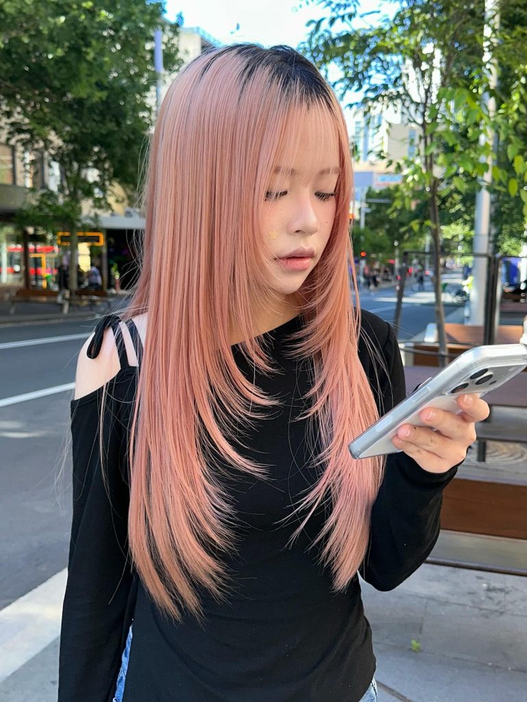 In this bold, avant-garde style, the wispy fringe is extremely fine and separated, creating a delicate veil over the forehead. The pastel pink strands are point-cut at varying lengths to enhance the “piecey” texture, mimicking the light, ethereal movement of a jellyfish cut. The low density of the bangs allows the dark roots and forehead to remain visible, providing a high-contrast, modern finish.