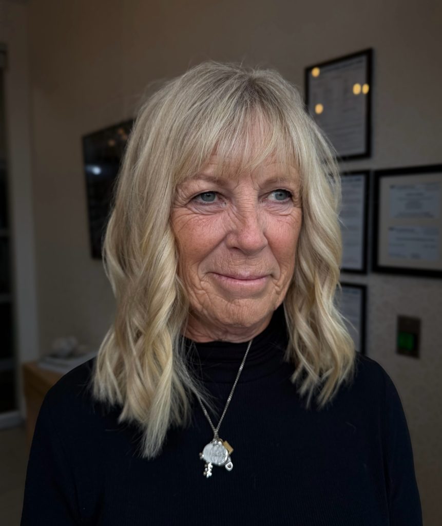 This genuine, warm portrait features an older woman smiling, looking slightly down and to the side. Her shoulder-length hair is a cool, natural-looking blonde with soft texture. Her fringe is a delicate, airy interpretation of the wispy bang. It is sparse and finely point-cut, offering soft framing around her eyes without adding unnecessary bulk. The style is classic, low-maintenance, and flattering, demonstrating the universal appeal of the fringe. She is wearing a black knit turtleneck and a thin silver necklace.
