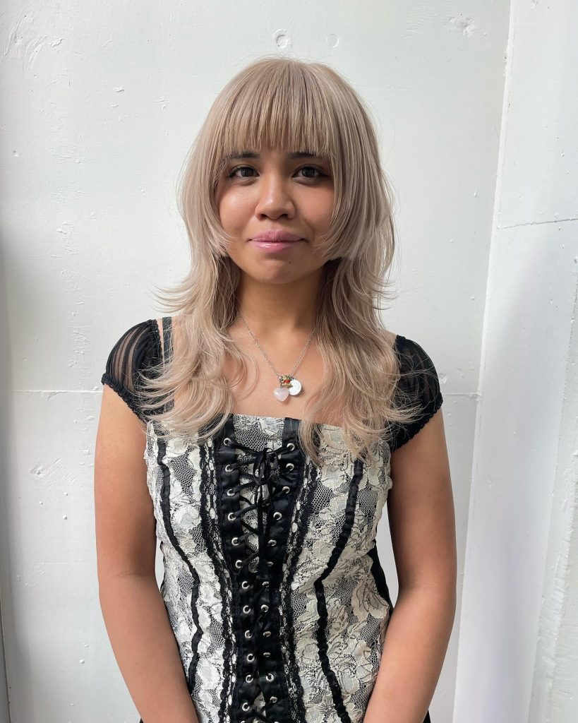 This style showcases a fuller-density wispy bang with significant point-cut texture. While it covers more of the forehead than a traditional “see-through” bang, the jagged, uneven ends give it a soft, “undone” aesthetic. The ash-blonde tones emphasize the separation between the hair strands, creating a cool-toned, edgy look that transitions smoothly into shaggy, shoulder-length layers.