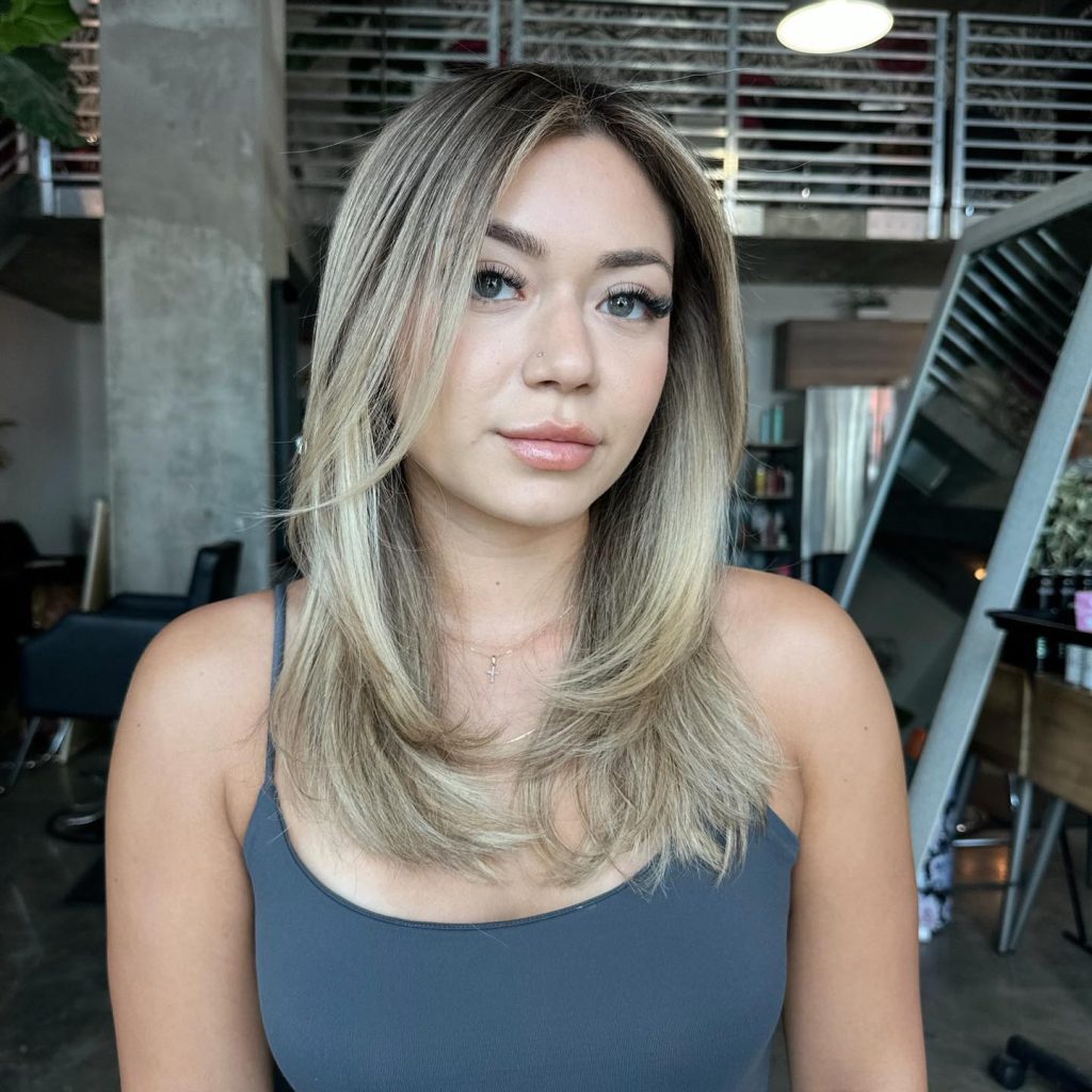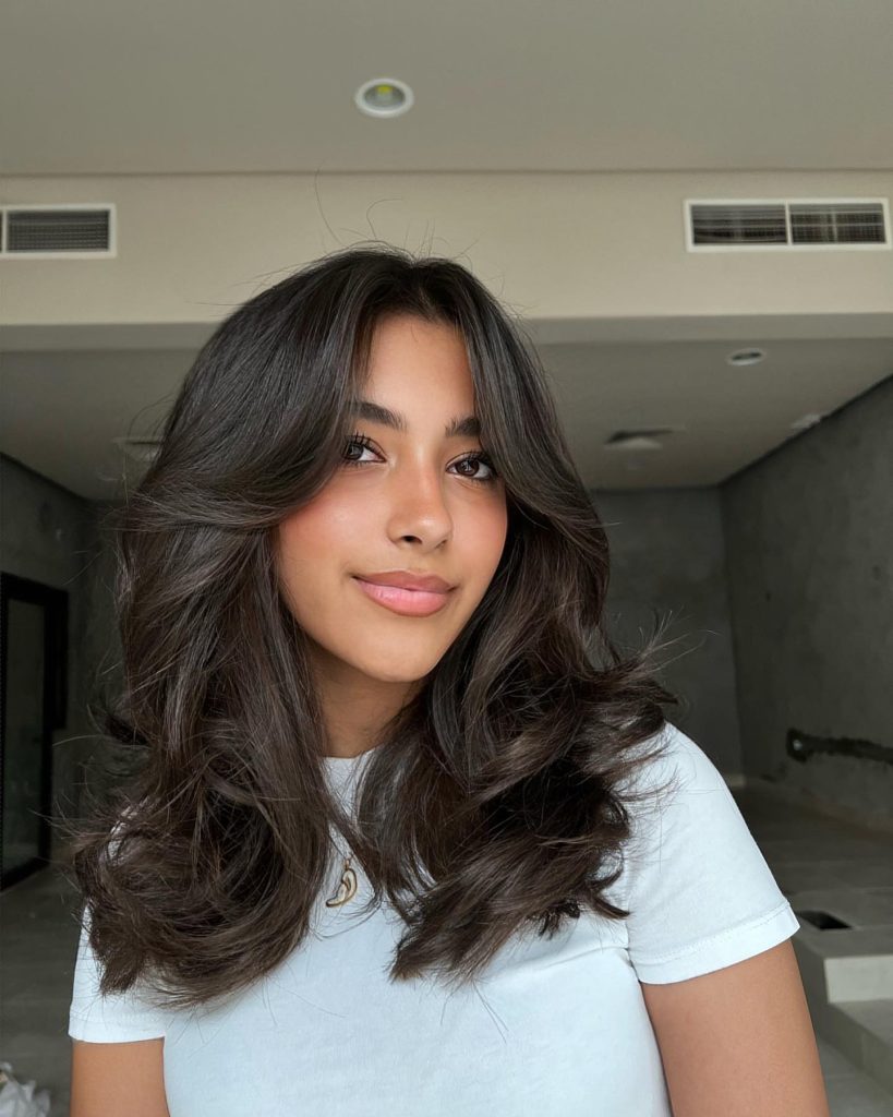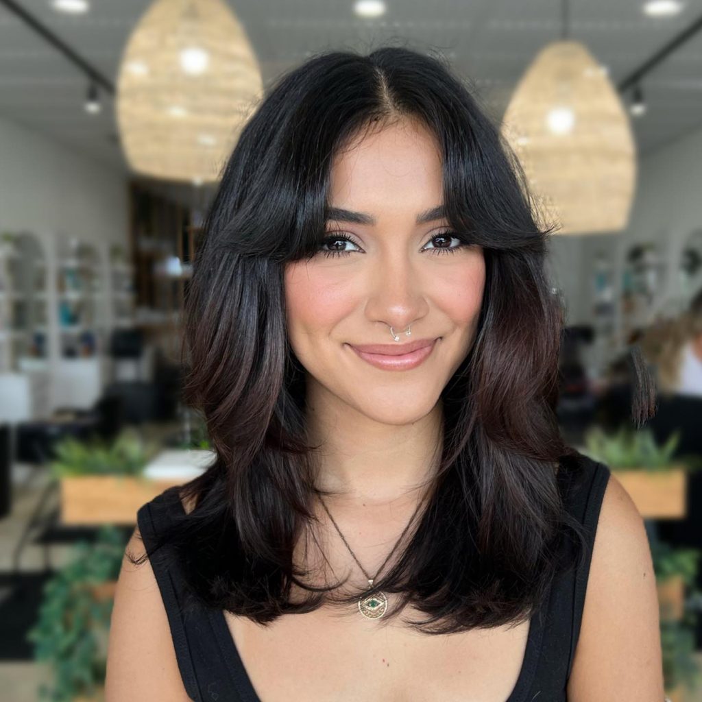For a heart-shaped face, this mid-length butterfly cut provides a masterclass in adding lateral width right where the chin begins to taper. The voluminous layers are styled to flip outward at the jawline, creating a horizontal weight line that harmonizes with a wider forehead. The center part and soft, face-framing “wing” layers ensure that the temples remain streamlined, allowing the added volume at the bottom to create a more oval-like symmetry across the entire frame.
