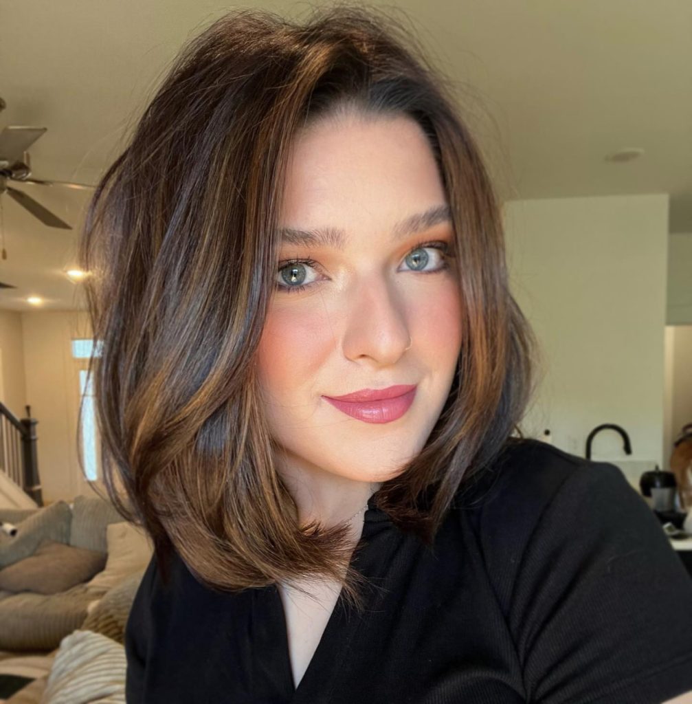 This voluminous long bob is an ideal solution for a round face shape because it prioritizes verticality over lateral width. The deep side part and height at the crown create an elongated silhouette that offsets the face’s natural 1:1 proportions, while the textured layers are designed to hit below the chin to avoid adding bulk to the cheek area. By using Piecey movement to break up the circular outline of the face, this cut successfully introduces a sense of structure and “visual angles” that harmonize a soft jawline.