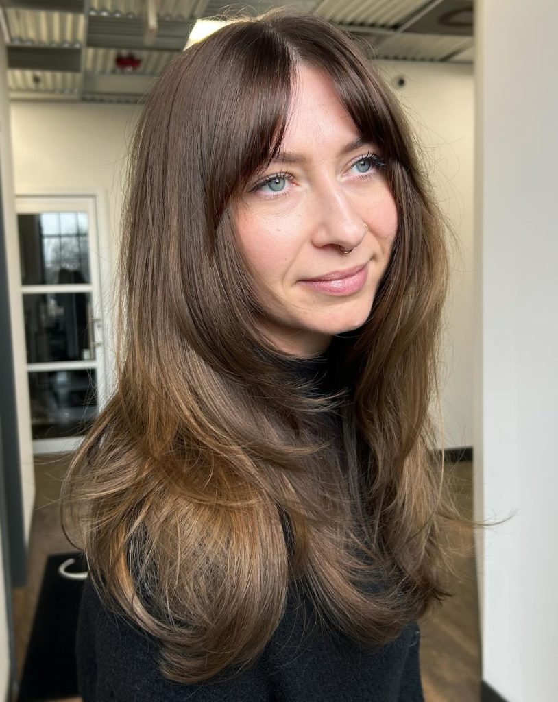 This look is specifically designed to soften the strong, angular forehead typical of a square face shape by introducing a curved horizontal line. The slight arch in the bangs prevents the hair from creating a “box” around the face, while the long, straight layers provide a vertical frame that draws the eye downward, away from the jawline. By keeping the texture smooth and the length extended, this cut achieves a balance that prioritizes movement and structural softness.